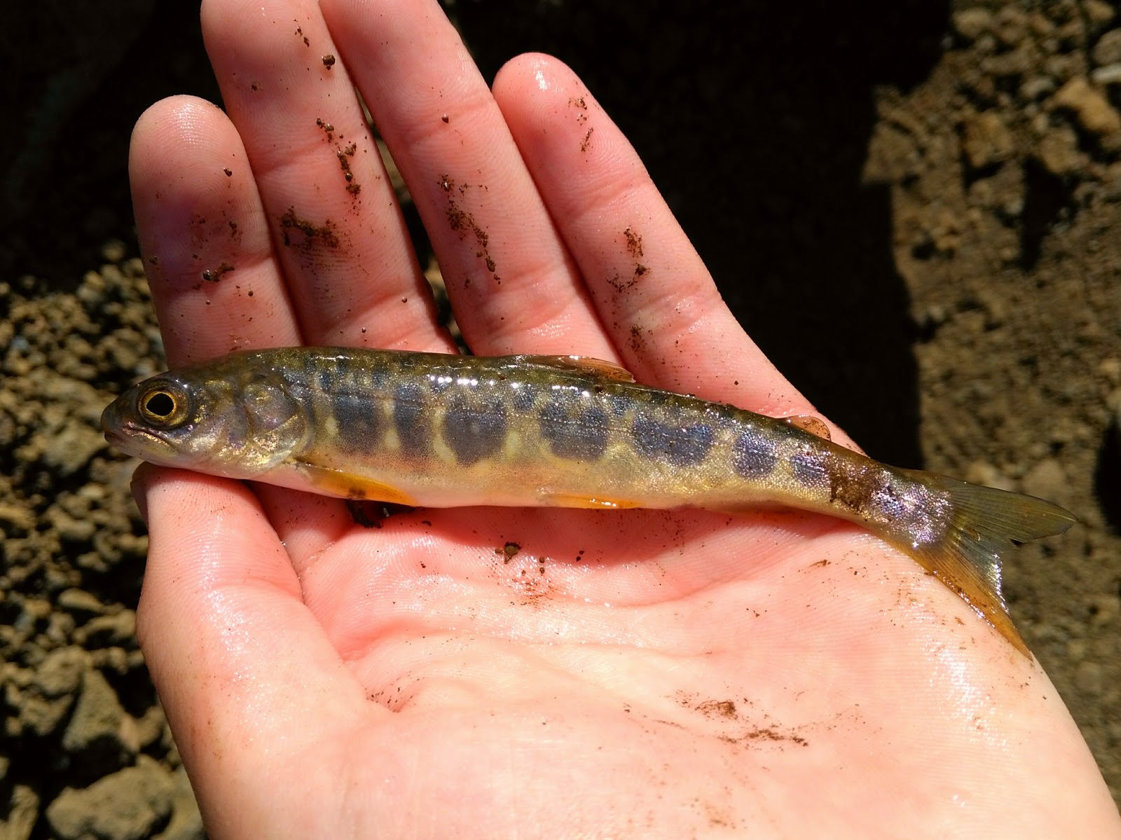 The big question was, trout or char? In the water, despite the clarity, I couldn't really tell, especially because I was looking off a cliff. Alas, I also couldn't tell when I got closer, because the fish were positively tiny and juvenile salmonids all look the same.